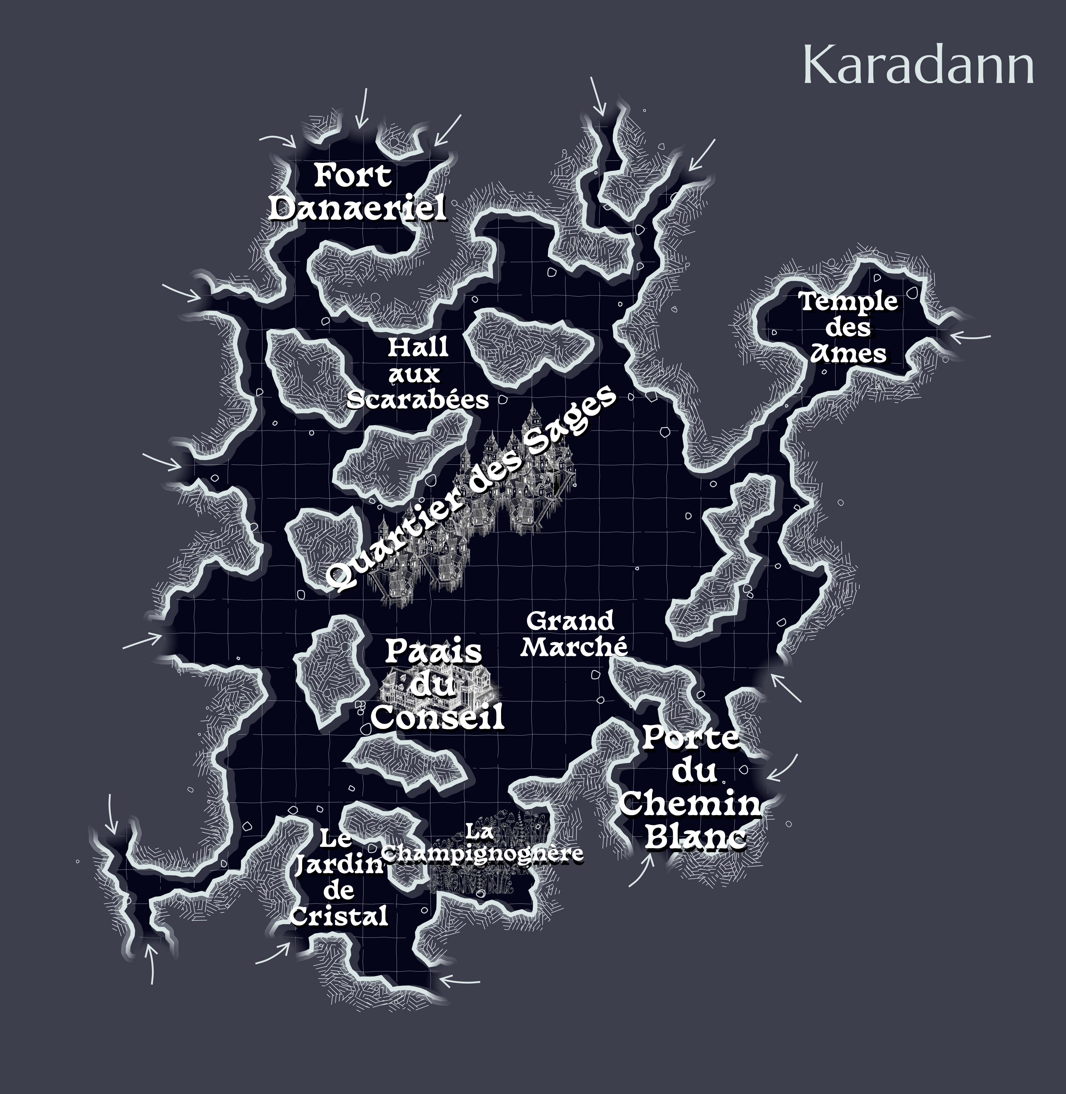 La première et la plus importante vertu enseignée par les Dits du Pays Sans Soleil est que le Peuple doit être protégé quoiqu’il advienne. C’est pour cela que les Elfes de l’Ombre ont construits des villes sous la terre. Leurs villes occupent un réseau de cavernes reliées des tunnels plus ou moins étroits. Cette forme d’urbanisme présente un avantage non négligeable: les villes de l’Ombre sont des véritables souricières pour quiconque voudrait les attaquer. Leur capitale, Karadann, est l’exmple même de cette vertu: une ville accueillante au premier abord mais où un ennemi aura tôt fait de se perdre et de se retrouver pris au piége.